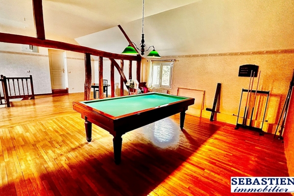 C'est une vaste propriété de 2 niveaux. Elle offre une pièce à vivre exceptionnellement spacieuse de 80 m² avec cheminée, colombages apparents, une cuisine aménagée et équipée, 9/10 chambres, salle de billard 70 m². Elle compte aussi deux salles de bains, une salle d'eau et deux toilettes, complété par une véranda de 26 m². Un chauffage fonctionnant au gaz y est installé. L'intérieur de la maison est en bon état. Fosse septique.